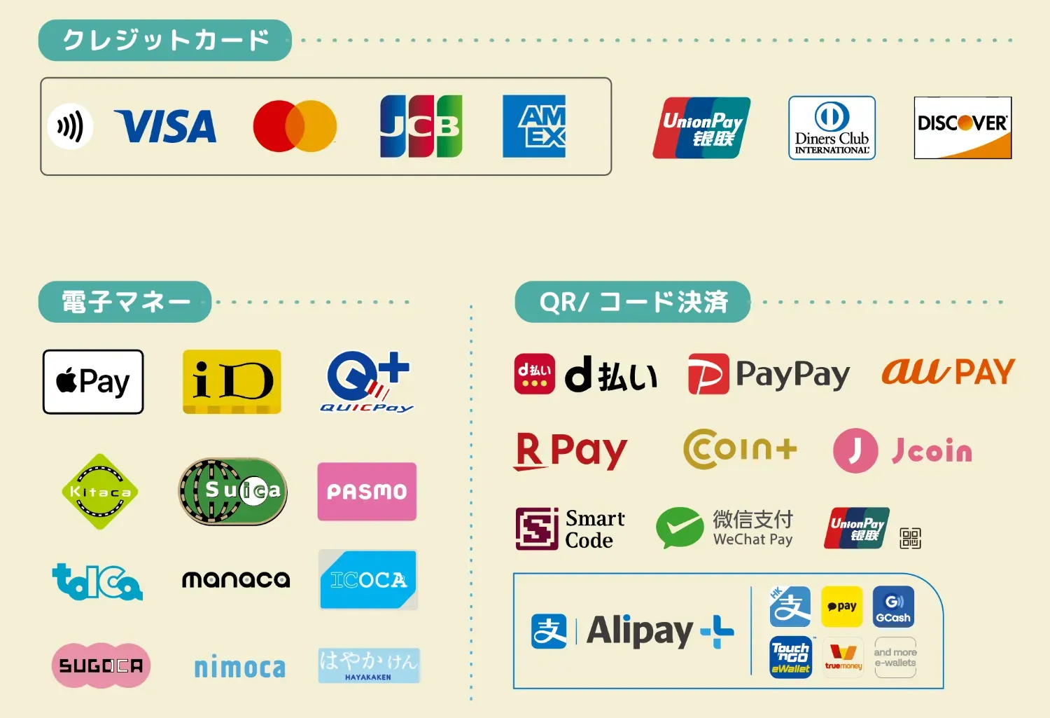 当店は現金の他、クレジットカード、電子マネー、QRコード決済など各種キャッシュレス決済がご利用いただけます。